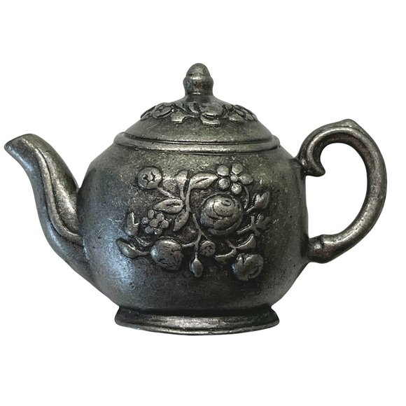 Vintage Pewter Teapot Floral Brooch Pin 2.5" Across