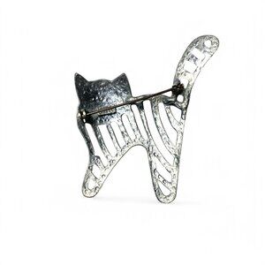 A charming vintage brooch featuring a playful cutout cat design with green eyes, crafted from pewter. Lightweight and easy to wear.