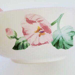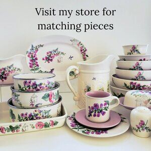 This vintage Pfaltzgraff Cape May stoneware features a charming light purple / pink floral design. Crafted in the USA between 1998-2001, it adds a nostalgic touch to any collection.