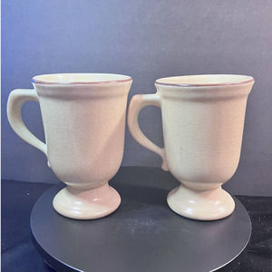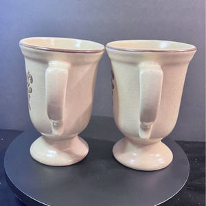 This vintage Pfaltzgraff Village footed pedestal coffee mug set is a delightful addition to any collection. The set includes two coffee cups, each standing 5 inches tall and made of sturdy stoneware. The charming design makes it perfect for all occasions.