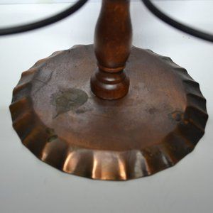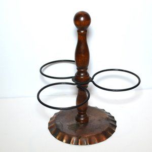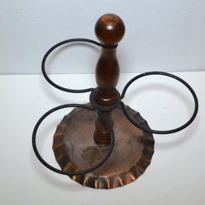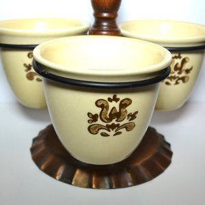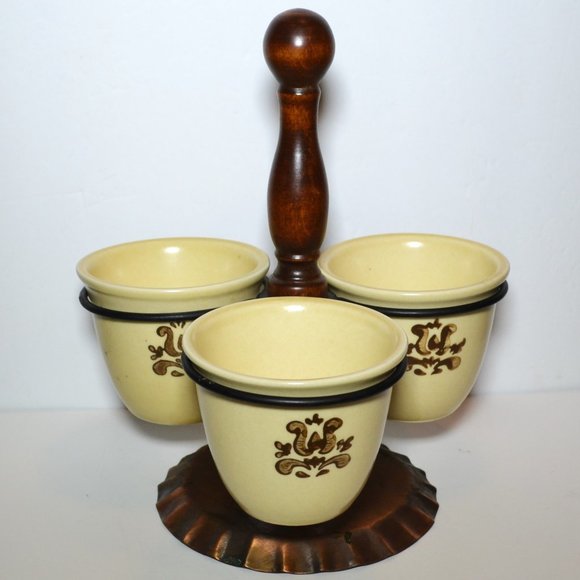 Accessory for Village Pattern by Pfaltzgraff. Condiment set for table. 3 cups on wooden post with copper rings and base. 9 inches tall, 5 1/2 inches base. Each cup is 3 inches high, 3 inch opening.