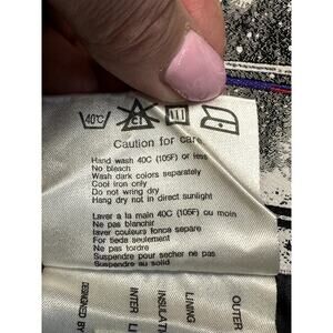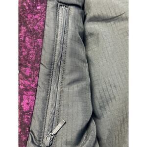 It is in good used condition, but the fabric has a few flaws; see images. The front zip closure is. There are 2 side zip pockets and 1 inside zip pocket. The approximate measurements from pit to pit are 27 " and shoulder to hemline are 26".