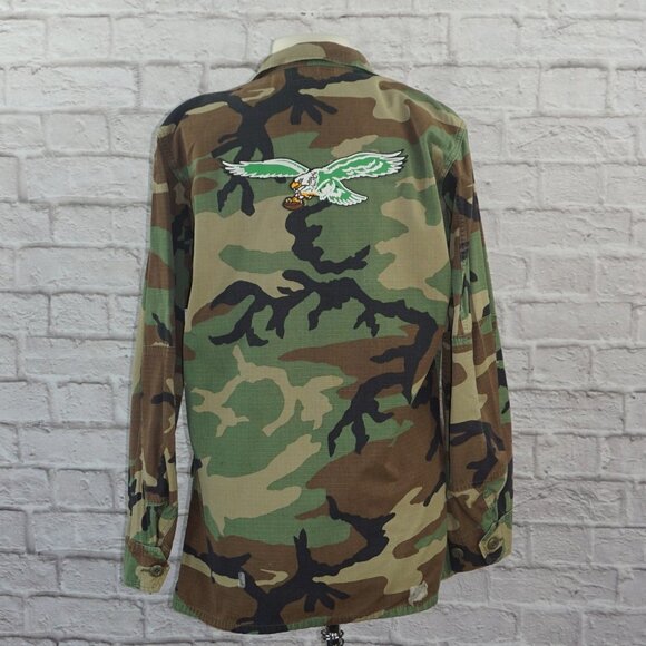 I hand stitched a vintage 80s Philadelphia Eagles Patch onto a Surplus Vintage Camo Military Jacket