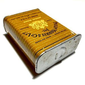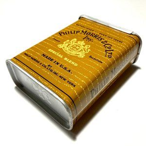 Empty slide-top cigarette case from the 1940s. “Philip Morris & Co. Ltd. Inc., special blend cigarettes” is printed on both sides . Made in the USA. Tin in great vintage condition. The brand, Philip Morris, is well-known in the tobacco industry and this tin is a testament to their history. It is a must-have for any collector of tobacciana. The tin is empty and sold as-is. In addition, I’m including a “girlie” matchbook from the same era.