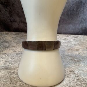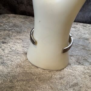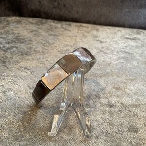 Vintage Philippines Silver and Abalone Shell Cuff Bracelet. Handmade in Phillipines. Oval in shape with an opening in the rear. 2-1/2" from side to side. 11 inlaid sections of abalone shell. 1/2" wide in center and tapers are ends to 1/4". Good condition.
