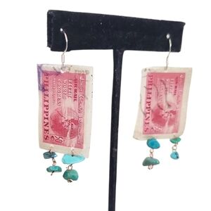 Vintage Philippines Stamp Earrings Turquoise Dangles Upcycled