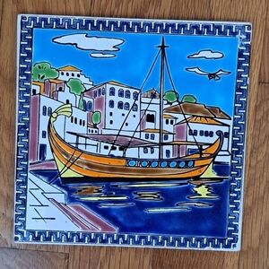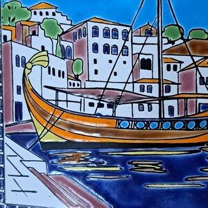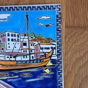 Vintage Philkeram Richards Vintage 11/68 Hand made in Greece ceramic tile C. Safarikinas Gondola boat village scene Textured Multicolor Bright colors See pictures for lay flat measurements Has few chips on the edges See all pictures for description and condition Collectible