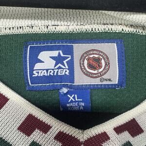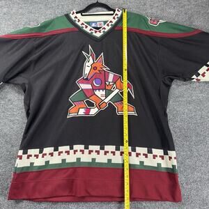 The product is a vintage Phoenix Coyotes Starter jersey in men's XL size, featuring black color with embroidered 90s Kachina design. It is officially licensed by the National Hockey League (NHL) and made by Starter, a well-known brand in sports apparel. The jersey is a great collectible for fans of the Phoenix Coyotes and hockey enthusiasts looking for a unique piece of fan apparel. Made in South Korea, this jersey showcases the team's history and fan pride with a classic design from the 90s.