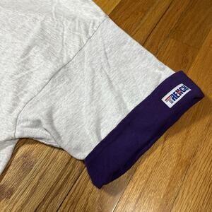 Cool vintage Phoenix Suns shirt that has a mock double layer design around the neck collar and on the sleeves (but not on the rest of the shirt) - meant to be worn with the double layer arm sleeves rolled up. Note a little asymmetrically pulled to the sides on the bottom and the faintest hint of a pink-ish discoloration near the bottom pointed out. Size XL. See pictures for details and measurements. Orders ship out on Monday, Wednesday, and Friday.