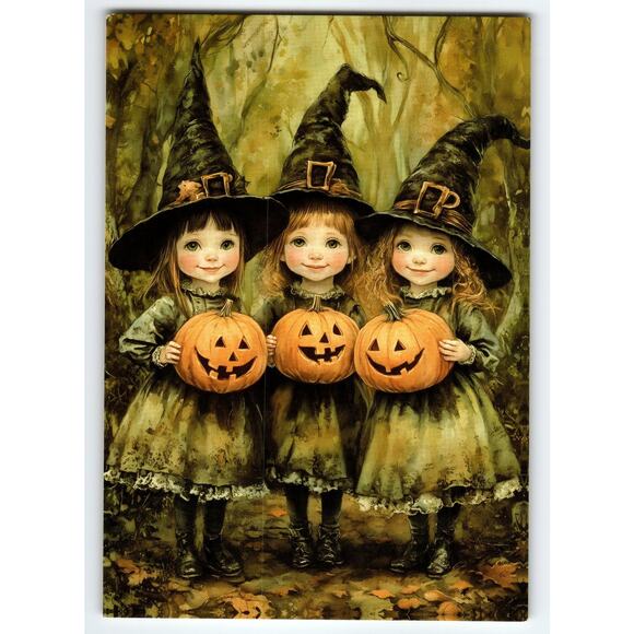 This charming vintage Halloween postcard features an enchanting lithograph image of three young girls dressed as witches, each holding a carved jack-o'-lantern. The scene is set in a softly lit, autumnal forest with earthy, muted tones that enhance the nostalgic and whimsical atmosphere. The girls wear traditional witch hats with buckles and matching dark green dresses with lace trim, perfectly capturing the Halloween spirit with a touch of innocence and magic.