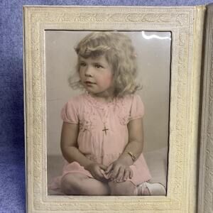 Vintage Photographs In Leather Folio, Two Hand Tinted Portraits Young Girl