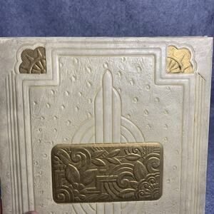 Beautiful cream and gold Art Deco leather folio with two 8” x 10” portraits. Subjects are a young girl, and her as a baby. Hand tinted, beautiful pieces of history.