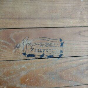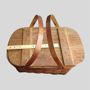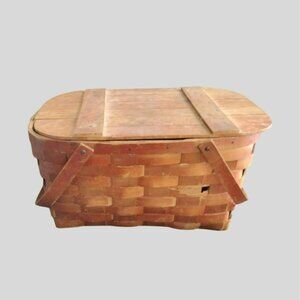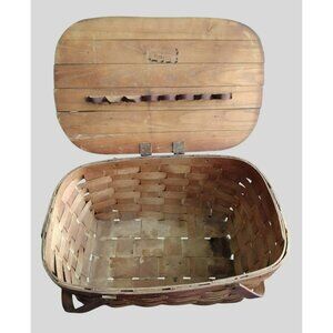 This mid-century wooden picnic basket features a woven design and sturdy handles. Crafted in 1940s by Wov-N-Wood by Jerywil, its rustic charm endures.