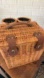 Features brown wicker woven design, 2 cylindrical wine bottle holders, brown straps w/ twist locks, & a fully open interior lined in green soft fabric.