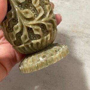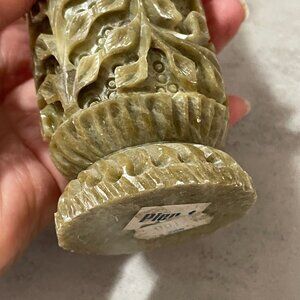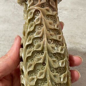 These are heavy, solid material which I think is soapstone but I could be wrong. Vines are carved vertically with notches at mouth of vases. They are primarily green with tinges of pink. Measures 6" tall. You get a matched set of two.