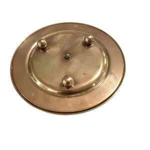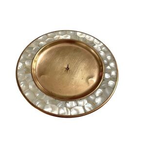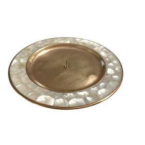 Enhance your home decor with this elegant decorative VTG Brass candle plate holder from Pier 1 imports featuring a stunning gold center and a cream border of mother of pearls inlay. Perfect for adding a touch of sophistication to any room.