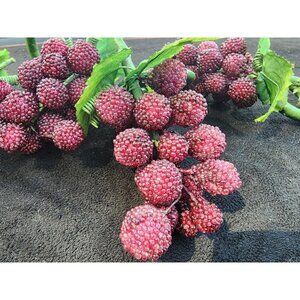 The product is a set of 4 bunches of sugared beaded grapes in purple and green colors, made of resin material by the brand Pier 1. These decorative fake fruit pieces are perfect for adding a touch of elegance to any home decor display, especially for those looking to add a vintage touch to their living space. The vibrant colors and realistic appearance of these grapes make them a beautiful and charming addition to any room.