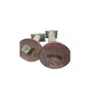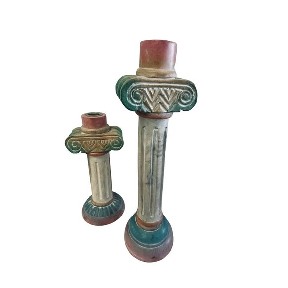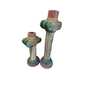 This Vintage Pier 1 Pink Green Hand Painted Aztec Pillar Candlestick Holder Pair is a beautiful addition to any home decor. Made from wood, their unique design brings a touch of Aztec culture into your space.