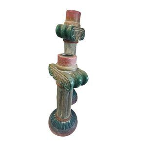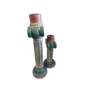 Vintage Pier 1 Pink Green Hand Painted Aztec Pillar Candlestick Holder Pair 13"