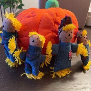 This is so precious! Found it in my mom’s holiday items. This is a soft zip up pumpkin with a scarecrow family inside! It’s supposed to have a little plush turkey in it also but it’s missing. Still super cute!! Clean home! Really adorable! We never saw this displayed, hoping someone will love it!