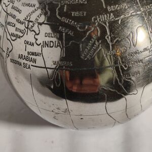The Vintage Pier 1 World Clock is a retro metal desk clock featuring a silver Art Deco globe design. This collectible piece is powered by batteries and exudes a classic charm with its vintage appeal. The metal frame adds a touch of durability and sophistication to any desk or shelf, making it a stylish and functional decorative item for any space.
