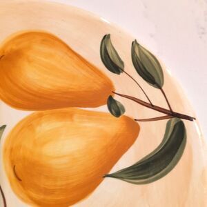 Vintage Pier 1 Imports Provence Round Hand Painted Earthenware Hot Plate Trivet Cheeseboard. This hand painted trivet features a butterfly, stem of pears and a stem of raspberries.