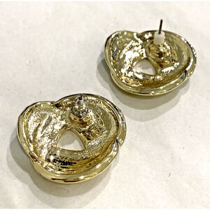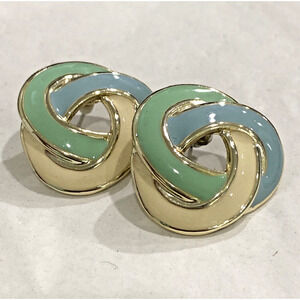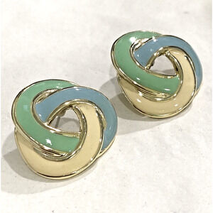 Vintage Pierced Earrings - classic 1980's Celtic Knot shapes done in light goldtone metal with pastel blue, cream and green enamel finishes. No hallmarks but nice quality fashion jewelry - round shape with open center. In excellent vintage condition - minor light wear - no damage or flaws - so cute!