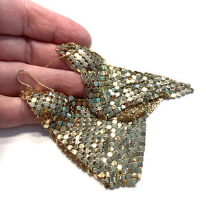Vintage Pierced Earrings in a Liquid Gold style - goldtone metal mesh that is woven to drop in a fluid look. These are drop and dangle style from wires - no hallmarks - have the look and feel of early Whiting & Davis although I think these are later probably from the 1970/1980 era. Perfect for your disco outfit - or any other dressy attire that needs some sparkling bling! Gently worn - minor surface wear - no damage or flaws - just stunning!