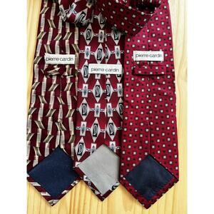 Pierre Cardin vintage sillk neckties from the 90s. All three ties are shades of red, burgundy or maroon. The ties are all standard width and length varies just a little. No flaws to note. Cleaned and stored in a smoke free home.
