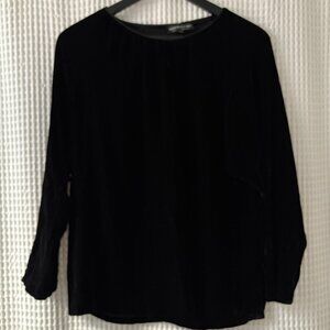 Vintage Pierre Cardin black velvet top. Label says size 6; flat, it measures 19 inches pit to pit. Pullover. Slits on either side at the waist. Label says dry clean, but it can be washed on gentle cycle and air dried.