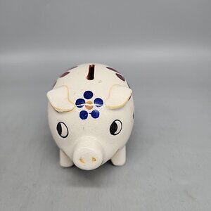 This vintage piggy bank baby pig ceramic figurine is hand painted in Japan, measuring 4 inches in height. It features a charming design with flowers, making it a lovely addition to any collection of pig-themed items. Made of ceramic, this piggy bank captures the whimsical theme of animals, specifically pigs, with its intricate details and craftsmanship. Perfect for collectors or those looking to add a nostalgic touch to their decor, this piece is a unique and charming find.