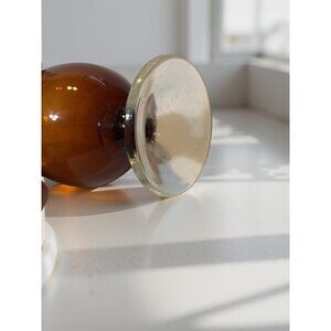 This striking vintage art glass ewer is attributed to Pilgrim Glass, known for their exquisite craftsmanship in West Virginia from 1949–2002. Featuring a beautiful amberina gradient from golden amber to deep brown, this hand-blown pitcher is finished with a clear pulled ribbed handle and a smooth, flame-polished base.