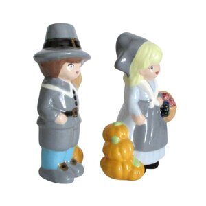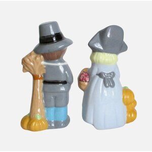 The vintage ceramic set features hand-painted Pilgrim figures of a pilgrim boy and girl and are marked on the bottom DC 89, adding a festive touch to fall and Thanksgiving table settings.