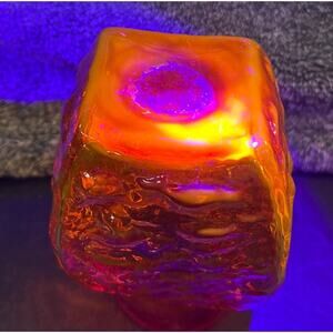 Vintage Pilgrim Glass Plymouth Patterned Amberina Hand Crafted Square Pitcher with Clear Glass Applied Handle. Glows amazingly under UV light (395) which shows the Cadmium beautifully.