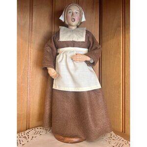 This handcrafted figurine depicts a traditional pilgrim woman in a brown dress and white apron, standing on a sturdy wooden base. Makes a perfect display for the Thanksgiving holiday.