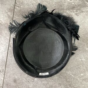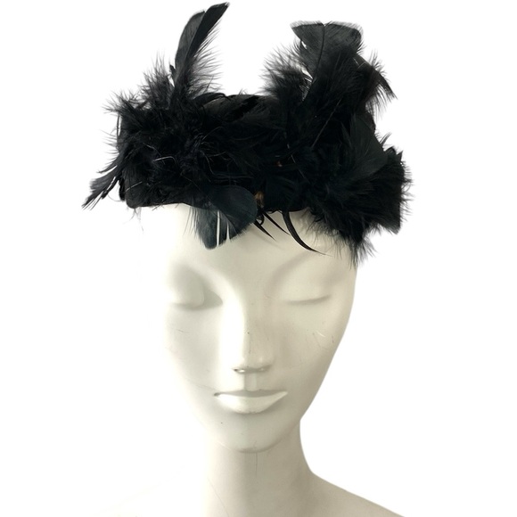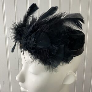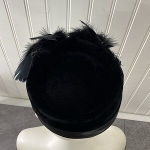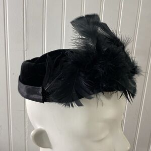Vintage Pill Box Hat Feathers Black Velvet Fascinator Formal Head Piece 22”