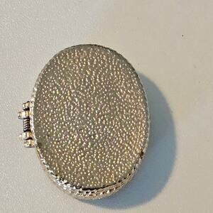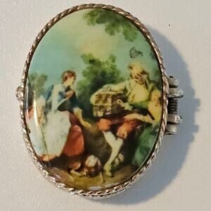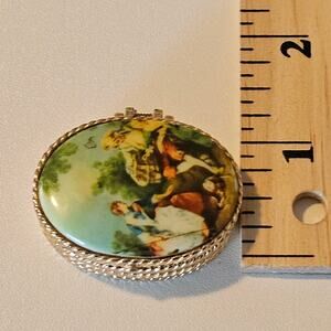 Vintage gold tone oval pill case or trinket box featuring a painted countryside scene with two figures and a dog. Hinged closure, does not lock. About 2 inches tall by 1 inch wide, measurements in photos. Very good pre-loved condition with only light wear - see photos for details where a small amount of the image is worn - not noticeable.