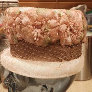 Charming vintage hat adorned with floral details. Features delicate netting overlay. Perfect for special occasions.