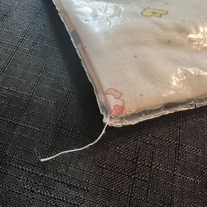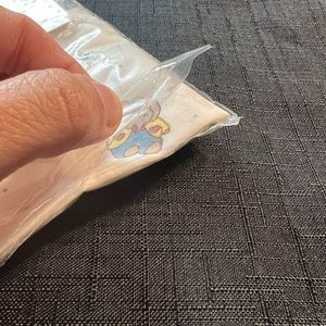 This vintage pillow case is noted to fit a standard baby pillow. Yeah I know we don’t give babies pillows these days but this isn’t for use. It is still in the packaging. There is a string hanging out from a corner of the package. There is also a tear in the seam of the package as shown in the picture.