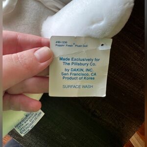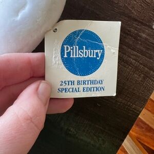 The product is a vintage 12" plush Pillsbury Doughboy toy, made in 1990 to commemorate the 25th birthday of the franchise. It is a classic piece of advertising memorabilia featuring the iconic white color and bakery & baking theme associated with Pillsbury. Complete with tags, this original plush is a must-have for collectors and fans of vintage advertising items.
