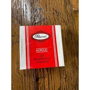 Vintage set of 6 Pimpernel acrylic coasters featuring historic clipper ships, each with detailed artwork and cork backing. Includes original red/white Pimpernel box. Ships featured include James Baines, White Star, Eliza Nicholson, Cutty Sark, Meridian, and Istamboul.