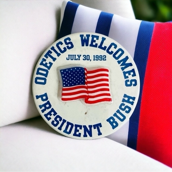 Discover a unique piece of history with this Vintage Pin Odetics President Bush Brooch Pin. This round tin #PoliticalPin features the message 'Odetics Welcomes President Bush' adorned with a classic American flag design, capturing a significant moment in political history. With a diameter of approximately 3”, this rare collectible is perfect for enthusiasts of #vintage memorabilia. The pin is in very good condition, making it a valuable addition to any collection.
