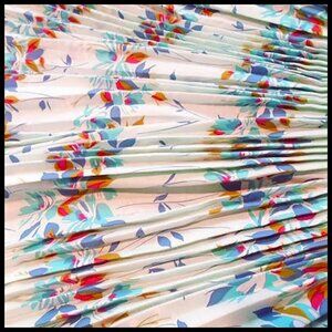 When I see a vintage apron, I think "Pinup Girl Photoshoot". "Ever-Pleat" apron keeps its pleats through washings! What?! "No ironing"?! The "Bonafab" trademark had not been registered yet, so think 50s to early 60s for this. Bonafab was associated with cotton garments, so this must be cotton. Unused, with stylized, mid century modern and a bit atomic floral. Shades of blue with red, green and white What you cannot see well in the photos is that the ends are trimmed with navy blue. Crisp and amazing. I have two of these one is NWT and one NWOT.