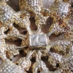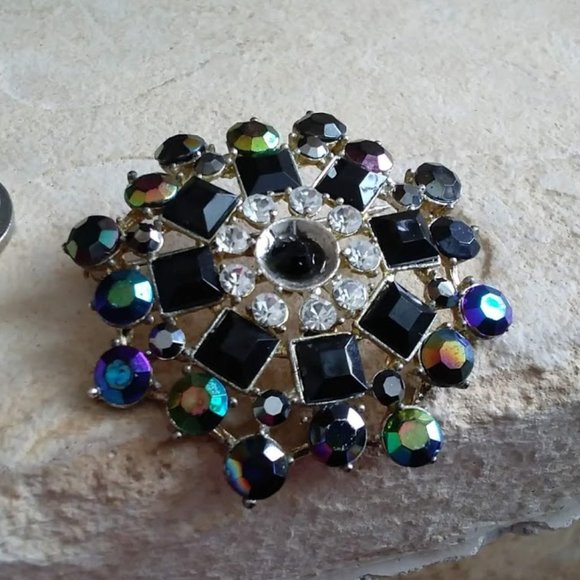 Vintage Pin with clear, black and aurora borealis black stones/rhinestones. Signed KC which I believe is Kenneth Cole. Found among my mother's belongings and don't know much about it other than very striking. The back looks to have some darkness/tarnishing but this doesn't appear to be silver.