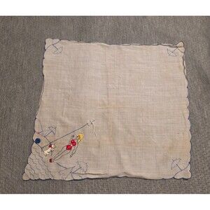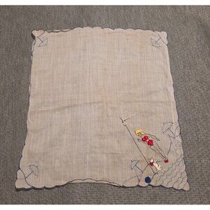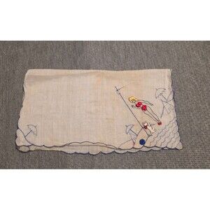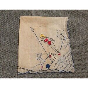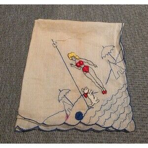 Vintage Pin-Up Bikini Blonde w/ Dog, Umbrella Handkerchief Hand Embroidered