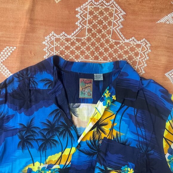 Bring the beach with you wherever you go in this vibrant vintage Pineapple Connection Hawaiian shirt! Featuring a bold sunset-inspired color palette of ocean blues, canary yellow, and tropical black palms, this shirt screams island vibes and chill times. Crafted from soft rayon for that breezy, relaxed drape that keeps you cool on steamy summer days or at your next tiki-themed bash.