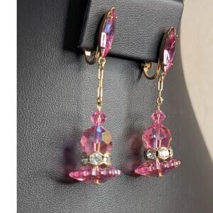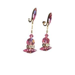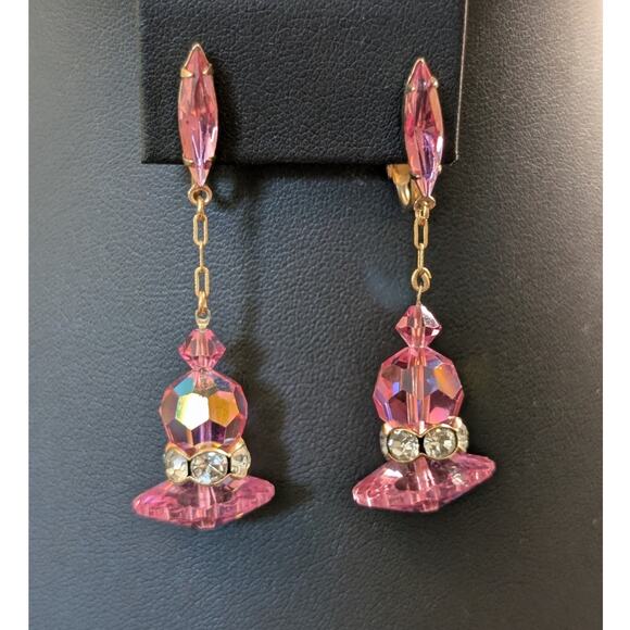 Vintage Pink AB Faceted Crystal Rhinestone Gold Tone Dangle Ear Clips