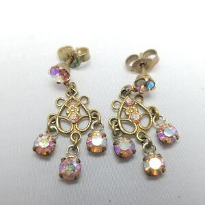Vintage Pink AB Rhinestone Dangle Stud Earrings Gold Tone Filigree Design Estate