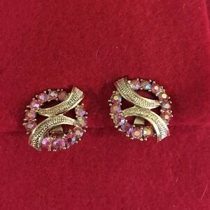 Pink aurora crystals in a gold setting. Clip style. Vintage just not sure from when. Very pretty and sparkly.