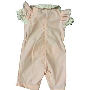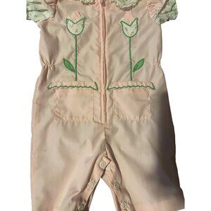This charming vintage baby jumper is crafted with a delicate pink fabric and adorned with tulip embroidery, adding a sweet, timeless touch. The jumper features ruffled sleeves and a floral collar, exuding an old-world charm. With a convenient front zipper and snap closures at the legs, it offers ease for dressing and diaper changes.